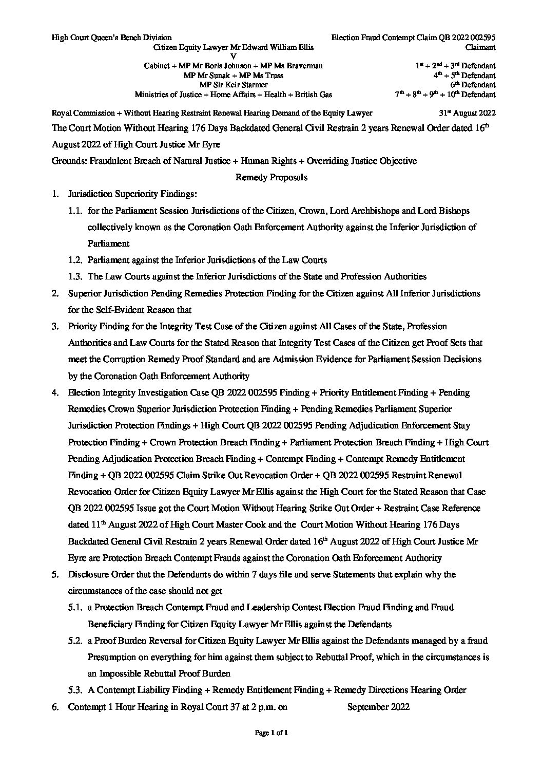 2022-08-31-Royal-Commission-QB-2022-002595-Without-Hearing-Restraint-Renewal-Hearing-Demand-of-the-Equity-Lawyer-Mr-Ellis-v-Cabinet-Others