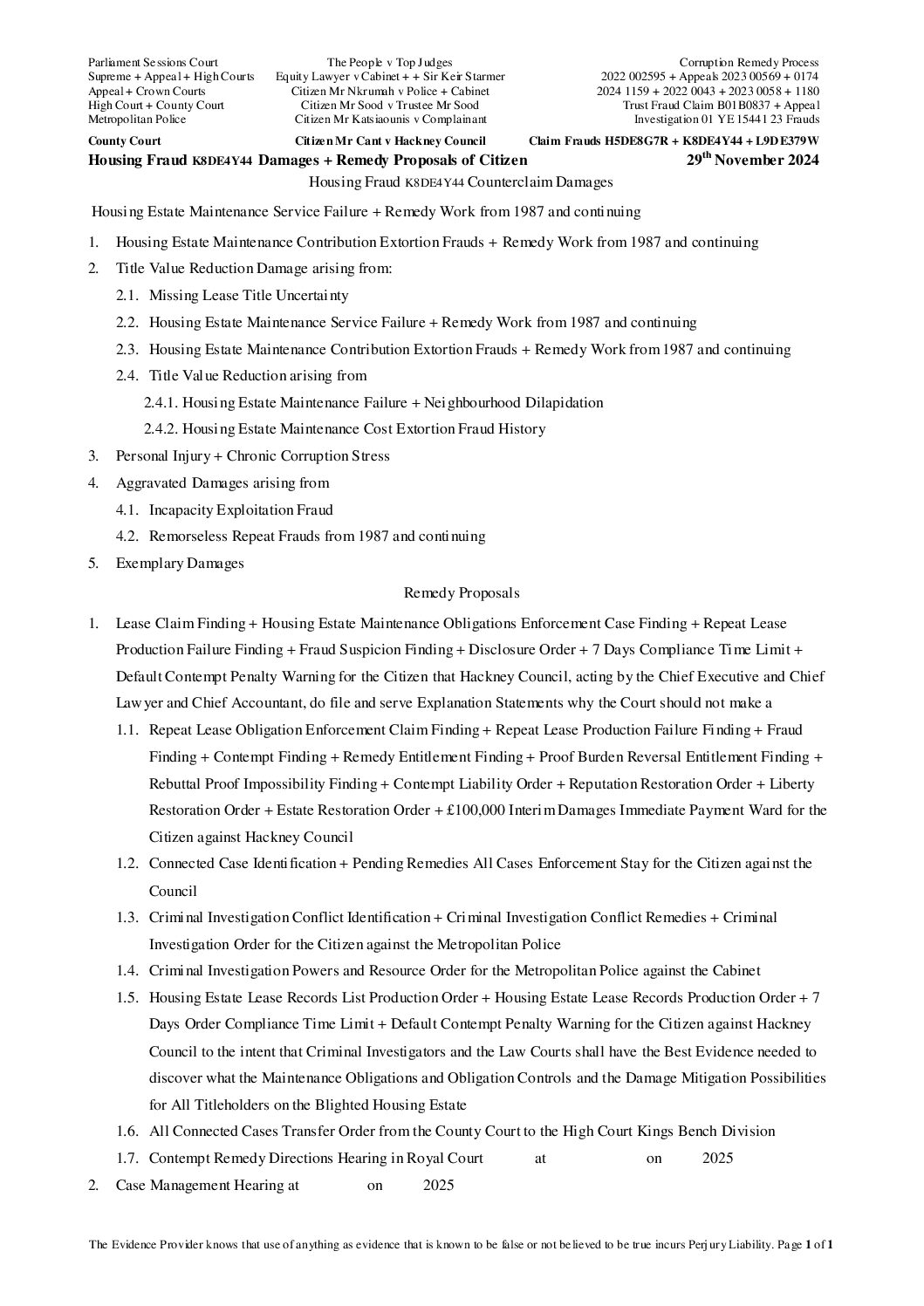 2024 11 29 Housing Fraud K8DE4Y44 Damages + Remedy Proposals of Citizen Mr Cant v Hackney Council