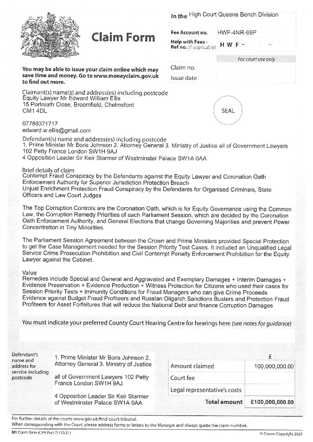 2022 03 18 Royal Commission + Contempt Claim Form HWF-4NR-69P + Signature of Equity Lawyer Mr Ellis v Prime Minister + Attorney General + Ministry of Justice + Opposition Leader n1-eng