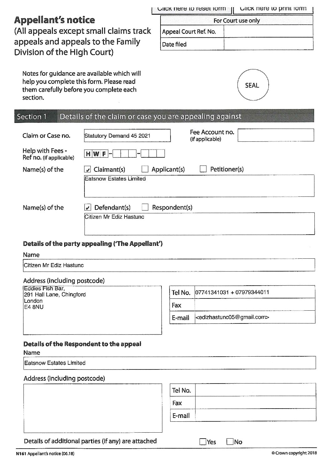 2022 05 22 Statutory Demand Set Aside Application 45 2021 Refusal Appellant Notice + signature of Citizen Mr Hastunc v Eatsnow Estates Limitedn161-eng – – Copy