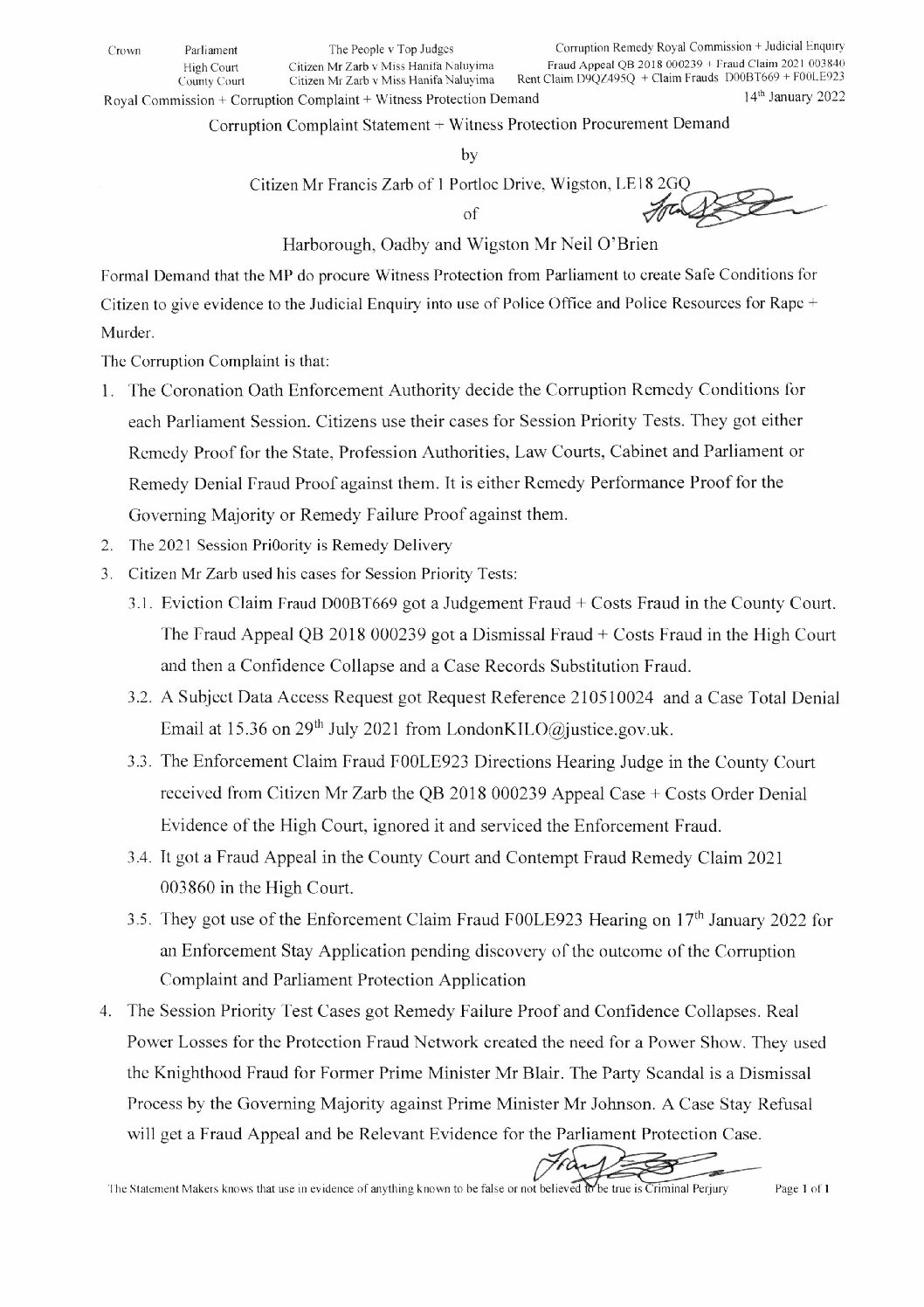 2022 01 14 Corruption Complaint Statement + Witness Protection Procurement Demand + Signature of Citizen Mr Francis Zarb v Harborough, Oadby and Wigston Mr Neil O’Brien