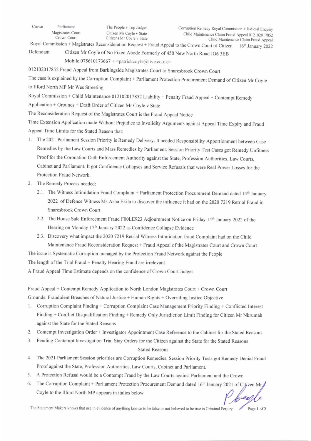 2022 01 16 Royal Commission + Magistrates Reconsideration Request + Fraud Appeal to the Crown Court to Crown Court + Signature of Citizen Mr Coyle v State