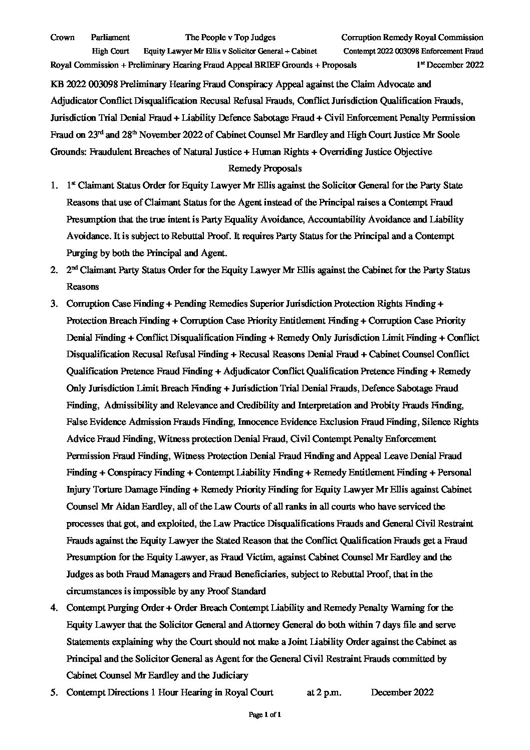 2022 12 01 Contempt KB 2022 003098 Preliminary Hearing Fraud Appeal BRIEF Grounds + Proposals of Equity Lawyer Mr Ellis v Solicitor General + Cabinet