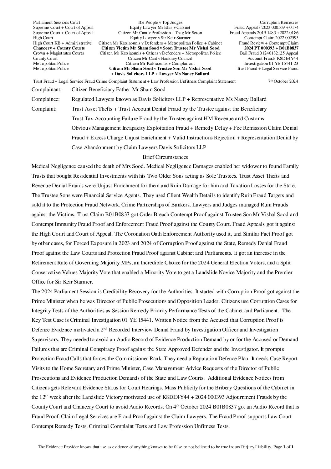 2024 10 07 Trust Fraud + Legal Service Fraud Crime Complaint Statement + Law Profession Unfitness Complaint Statement of Citizen Mr Sham Sood v Trustee Mr Vishal Sood + Lawyers