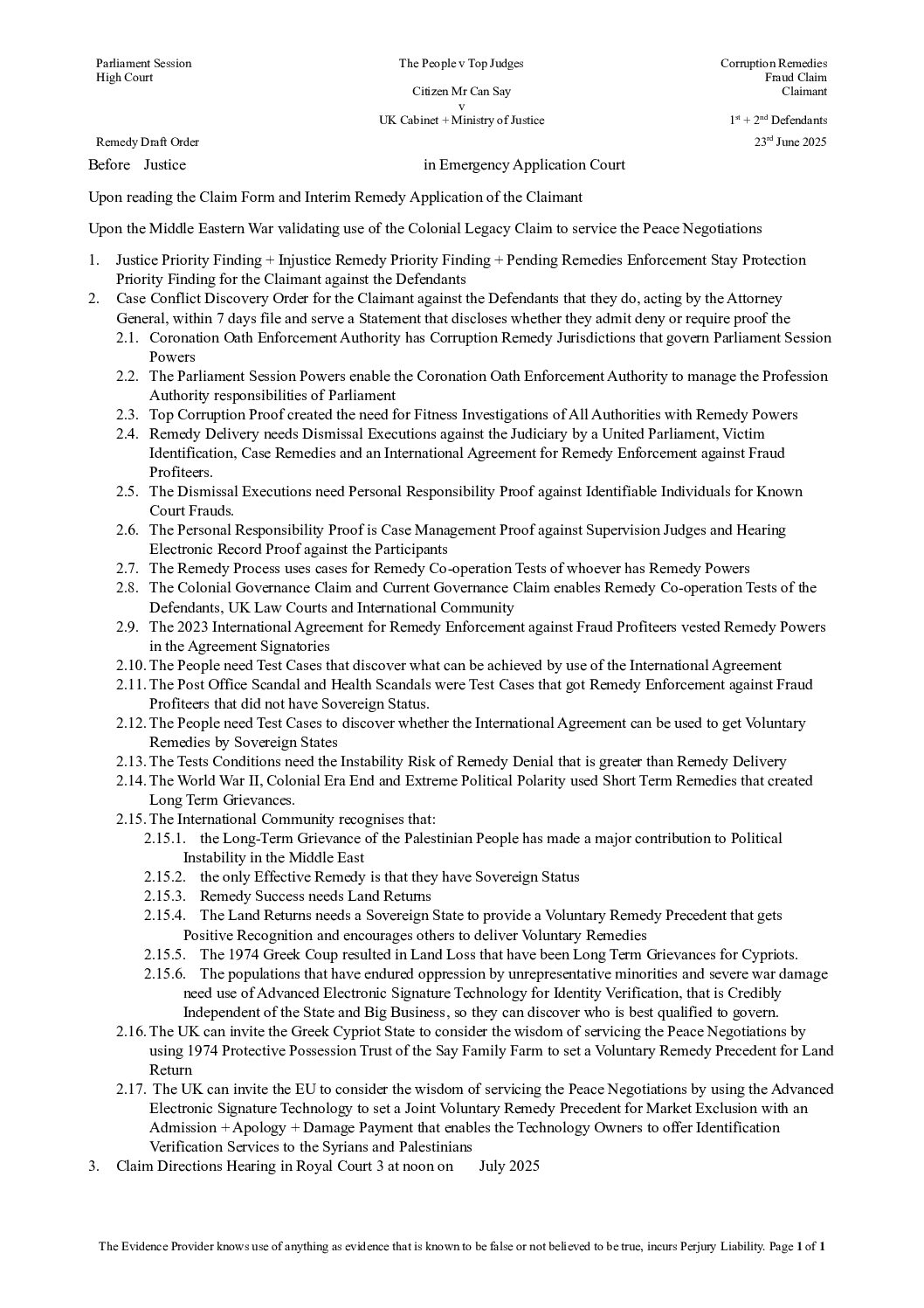 2025 06 23 Fraud Claim Draft Remedy Order of Citizen Mr Can Say v UK Cabinet + Ministry of Justice