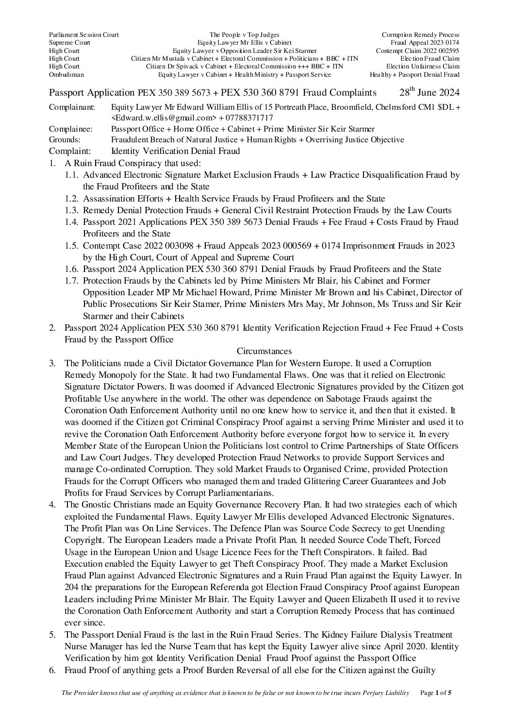 2024 07 19 Passport Application PEX 350 389 5673 + PEX 530 360 8791 Fraud Complaints of Equity Lawyer Mr Ellis v Passport Office + Cabient + Prime Minister Sir Keir Starmer