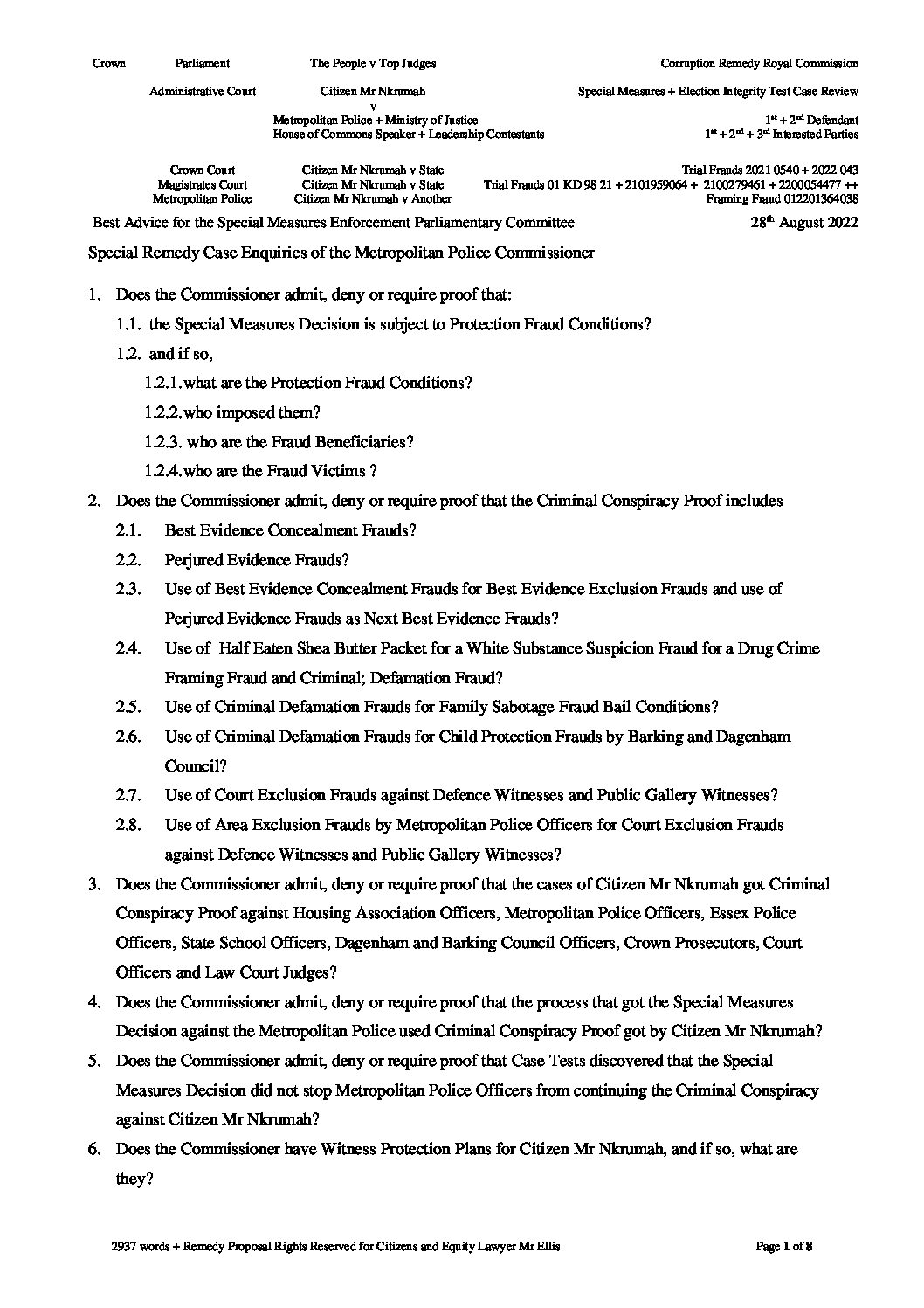 2022 08 29 Royal Commission + Special Measures Enforcement Questions Advice for the Parliamentary Committee v Target Authorities