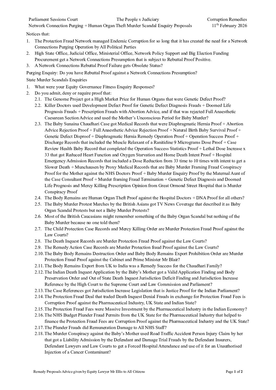 2026 02 11 Network Connection Purging Proposals + Human Organ Theft Murder Scandal Enquiry Proposals of Equity Lawyer Mr Ellis for the People v Politicians